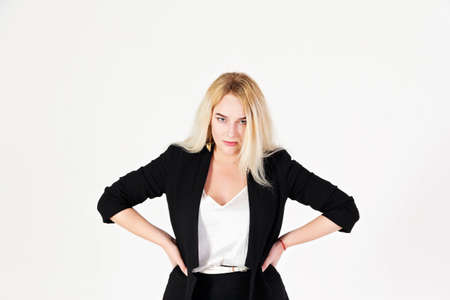 Studio portrait of blonde girl isolated on white background. Reference photo of an arrogant girl for various projects.