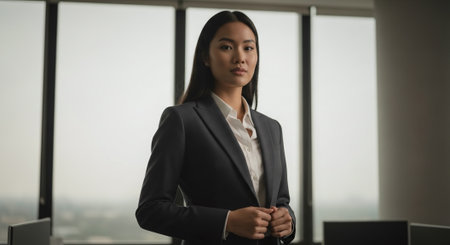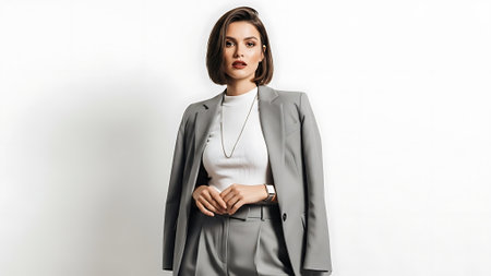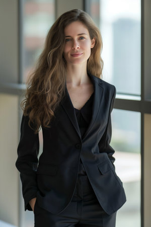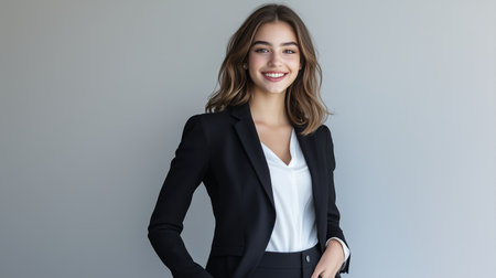 Businesswoman in a suit, standing confidently with a smile