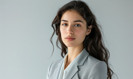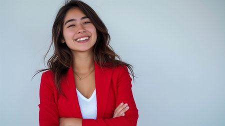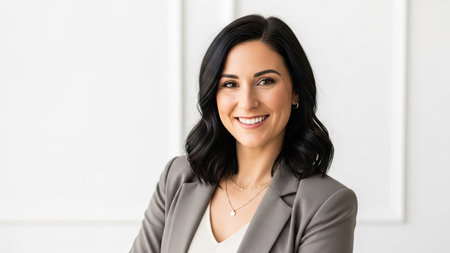 A woman is the central subject in a bright, studio-lit portrait. She is smiling, with dark hair, and wears a professional blazer. The composition features a clean, white background, suitable for various uses. The image could be utilized for business, lifestyle, or editorial applications.
