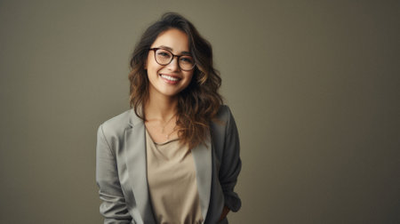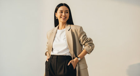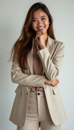 A stylish young woman with long hair poses confidently in a beige suit, radiating professionalism and warmth. Her bright smile and relaxed posture convey a sense of approachability and self-assurance, perfect for business or personal branding.