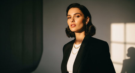 A confident woman in a stylish black blazer, standing in soft light with shadows, showcasing a modern and elegant look