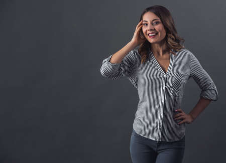Attractive young woman in casual clothes is looking at camera and smiling, on gray background