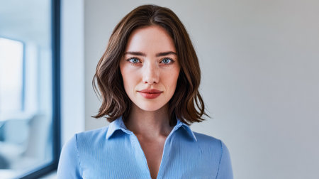 A woman with shoulder-length brown hair stands confidently indoors, showcasing her striking blue eyes and casual attire. Natural light emphasizes her features against a soft background.