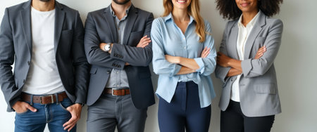 A diverse group of four professionals stands confidently with arms crossed, exuding a sense of teamwork and determination. Their stylish attire, ranging from tailored suits to smart casual wear, reflects a modern workplace vibe, while their warm smiles convey a welcoming and collaborative atmosphere.