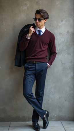 A fashionable young man stands confidently against a textured gray wall, exuding charm and sophistication. His maroon sweater paired with tailored navy trousers and sleek shoes creates a striking contrast, showcasing modern elegance and style.