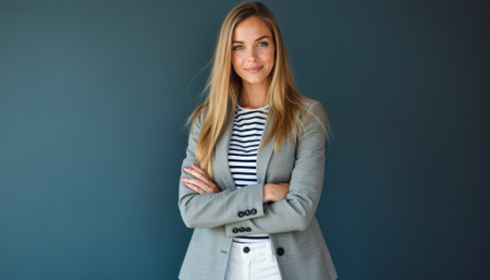 A poised young woman with long blonde hair stands confidently against a deep blue background, exuding professionalism and charm. Her striped shirt and tailored blazer create a chic look, perfect for business or casual settings.