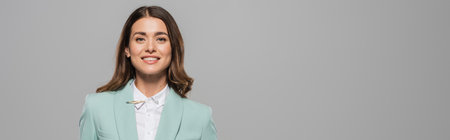 Portrait of cheerful brunette host of event in blue formal wear looking at camera during holiday while standing isolated on grey with copy space, banner