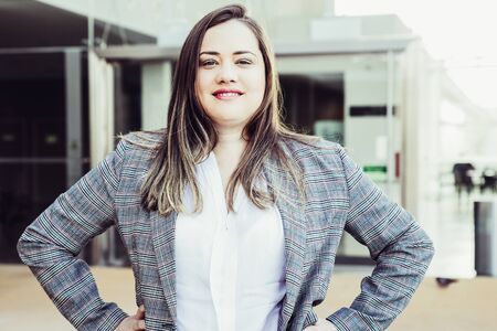 Smiling business woman keeping hands on hips outdoors. Lady looking at camera and standing with building in background. Business lady portrait concept. Front view.