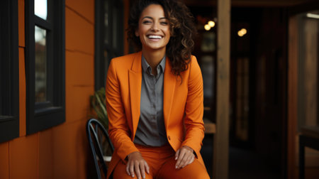 A woman in an orange suit sitting on a chair. Generative AI image.