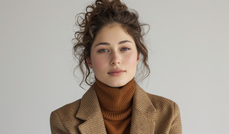 a woman in a tan turtleneck and jacket.