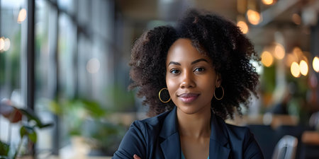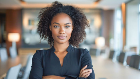 beautiful black business woman smiling at the camera in an office, in the style of balanced asymmetry.