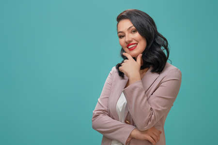 Smiling beautiful young woman in pink costume posing on turquoise background.