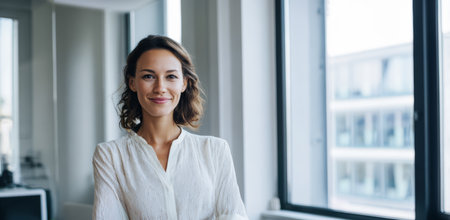 Confident Young Professional Woman Smiling in Modern Office Natural, Bright, Airy Portrait