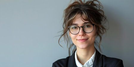 Businesswoman in glasses smiling and looking away at copy space symbolizing job opportunities or business services. Concept Businesswoman, Smiling, Glasses, Copy Space, Job Opportunities