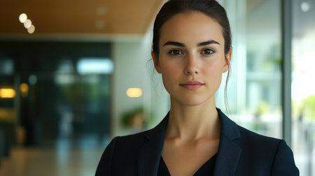 A businesswoman with a sharp, professional appearance, standing in front of a glass conference room, looking confidently at the camera with her face clearly visible.