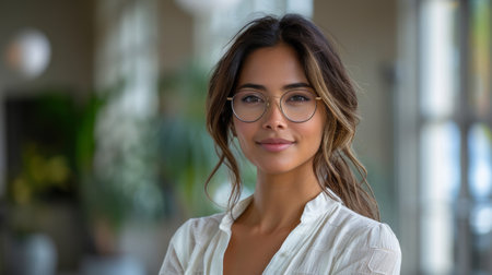 A confident woman with long, dark hair is wearing glasses and a white shirt. She is looking directly at the camera with a serious expression. The background is a blurred office setting with windows and office furniture. The woman is confident and professional, and she appears to be ready for a challenging task or a new opportunity.