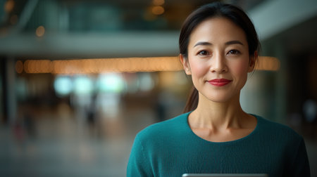 Confident female professional holding a tablet in a modern office environment, radiating leadership and poise.
