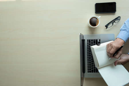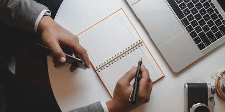Overhead shot of young professional businessman writing his idea concept on notebook while working with laptop computer