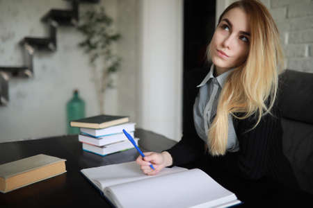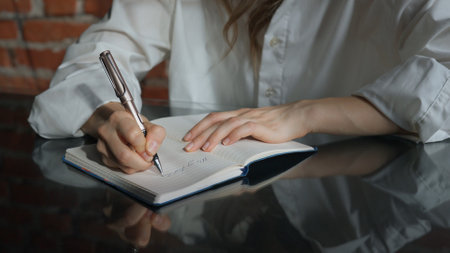 Woman sitting at office desk opens and writing notes in diary with pen, concentrated person writing down ideas and tasks, close up shot.