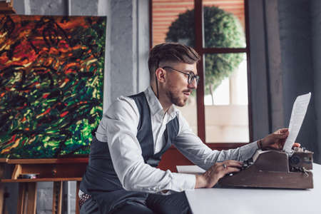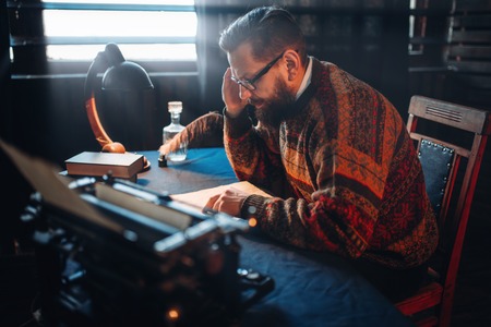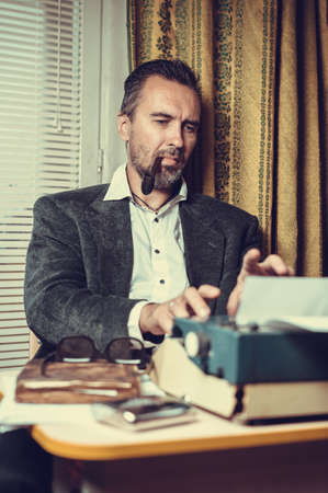 Vintage journalist working in the office: he is sitting at desk and typing on a typewriter