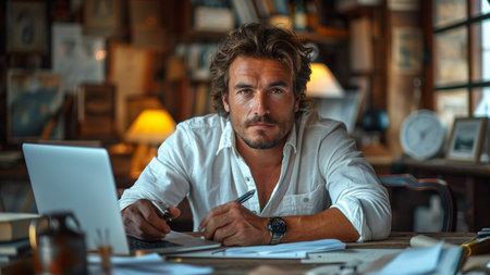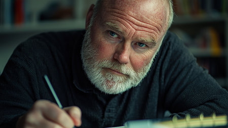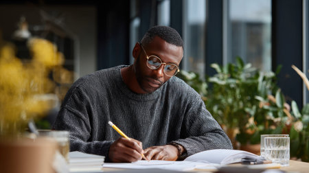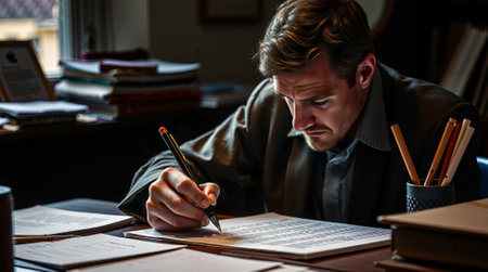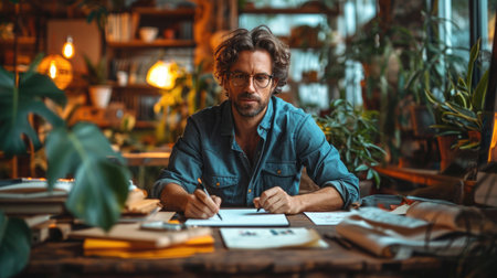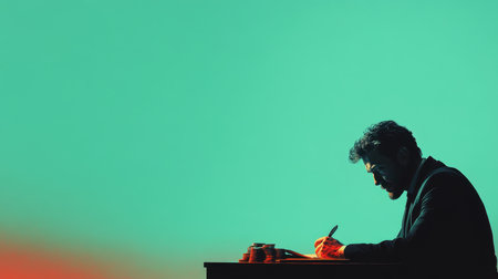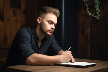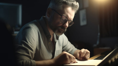A man intensely concentrates, writing in a notebook within a vibrant studio Surrounded by books, a black desk lamp illuminates his focused work His thoughtful gaze and the dynamic setting highlight a moment of deep creative exploration, detailed planning, and artistic atmosphere AI Generative