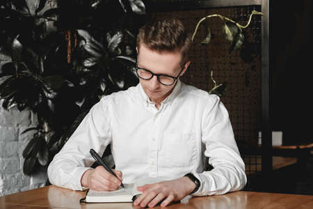 Serious young man wearing white shirt and eye glasses sitting at the table holding pen takes notes to his agenda on a dark background in office. Copy, empty space for text.