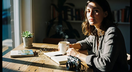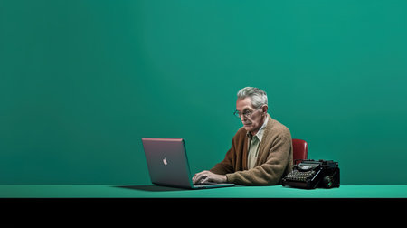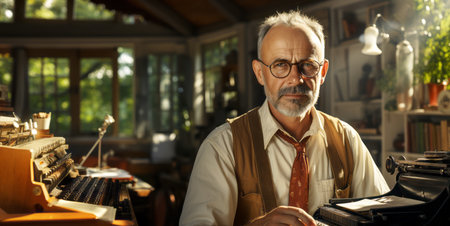 Warm, nostalgic scene depicting a writer using an old-fashioned typewriter in a room bathed in sunlight. Generative AI
