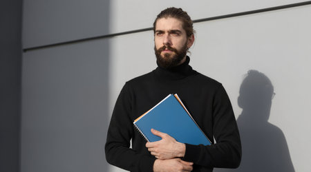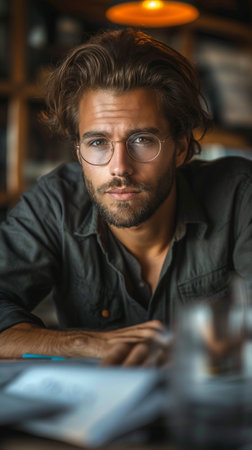 The Intellectual Writer: A Glimpse into the Pensive World of a Dark-haired, Bearded Wordsmith, Engrossed in His Notes