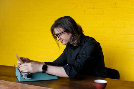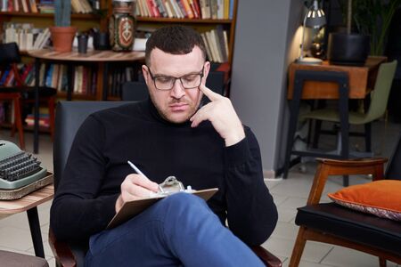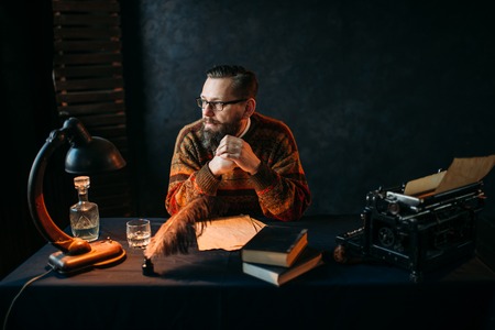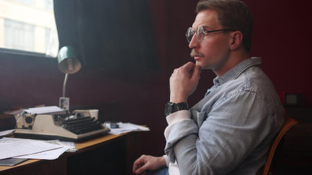 A man in eyeglasses and black dressed, seated at a table in office, thinking about of a new idea, working on a old vintage typewriter, Copy space.