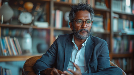 Engaging Discussion With Thoughtful Man in Casual Attire in Cozy Library Setting