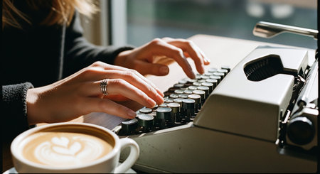 a beautiful old retro typewriter close-up, hands and a cup of coffee