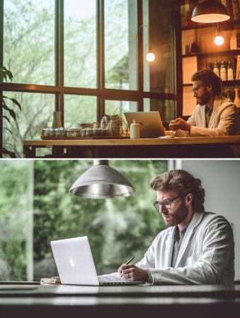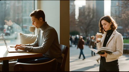 Programmer at remote job Young man drinking coffee from a Cup Freelancer work on netbook in modern coworking Successful people businessman in comfortable cafe High large : Generative AI