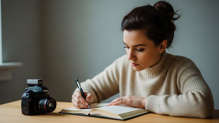 Journalist writing notes with a pen, showcasing thoughtfulness in a serene setting