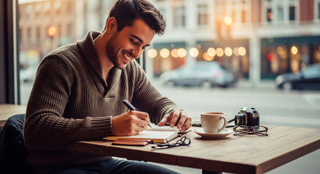 A smiling man in a brown sweater writes in a notebook at a wooden table with a cup of coffee, glasses, and a camera, set against a blurred city street background.