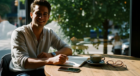 A smiling young man sits at a wooden table in a cafe, surrounded by a notebook, coffee cup, cell phone, and glasses, with a blurred outdoor background.