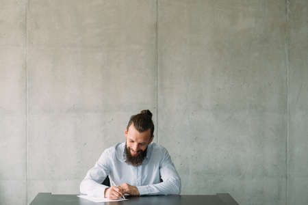 Corporate life and paperwork. Successful business man writing letter, smiling. Gray wall background. Copy space.