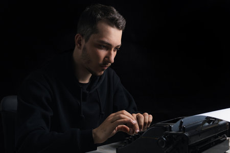 Young handsome man in black hoodie is typing on a typewriter, on a black background in low key