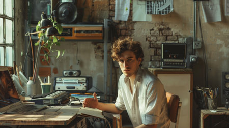 A young man sitting in a vintage-style office filled with retro equipment, perfect for themes related to creativity, workspace, and vintage aesthetics.