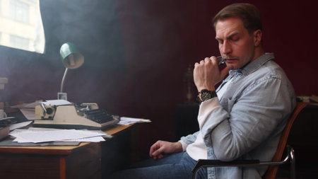 Thoughtful writer in smoky vintage study, cinematic composition with soft-focus on typewriter and smoke.