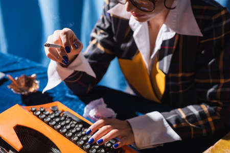 cropped view of blurred woman with cigarette typing on vintage typewriter on blue background