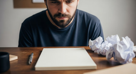 A person in a creative crisis is sitting at a desk, staring at an empty notebook. The crumpled sheets of paper symbolize failed attempts and the search for new inspiration.