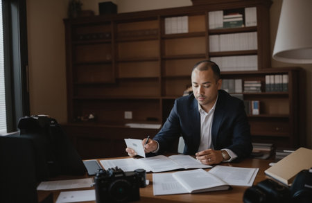 With focus and determination, a hand grips a pen, carefully signing important documents amid papers and office supplies, evoking a sense of responsibility.