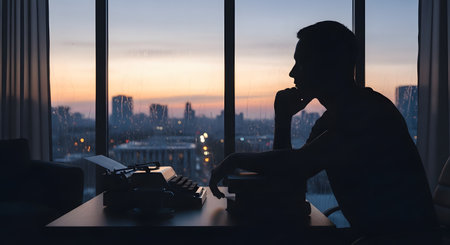 The silhouette of a thoughtful writer sits at a desk in front of a large window, looking out at a city skyline at dusk. A vintage typewriter and a stack of books are on the desk, creating a classic, contemplative atmosphere. The image represents creativity, inspiration, authorship, and the solitary life of a novelist or journalist.