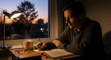 A man sits at a desk writing in a notebook under the warm glow of a lamp, with a twilight city view visible through the window. The image evokes a mood of evening reflection, creativity, and peaceful journaling.