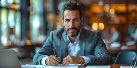 Confident businessman signing contract in office with corporate finance background. Concept Businessman, Contract Signing, Office Setting, Corporate Finance, Professional Attire