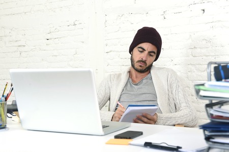 young trendy businessman in cool hipster beanie look writing on pad working in at modern home office with computer laptop as creative designer in freelance business concept