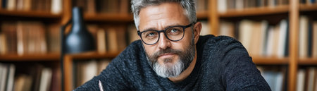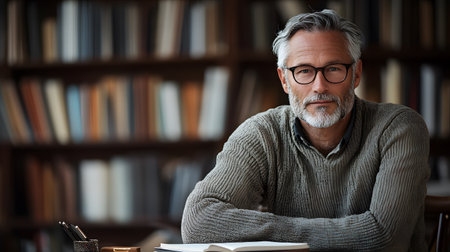 A thoughtful man with gray hair and glasses sits at a desk. Shelves of colorful books provide a warm backdrop.