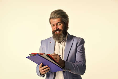 business man wearing smart casual clothes. handsome man work with business documents. Portrait of businessman hold office folder. professional businessman waiting for partner. make notes