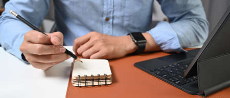 Cropped shot of male freelancer working on his project while collecting ideas from notebook in comfortable workspace