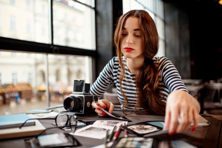Young woman photographer looking at the printed photos with old 6x6 frame camera sitting in the cafe with loft design interior